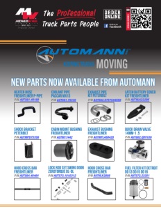 CATALOG NUMBER 00 New Parts Now Available from Automann COOLANT PIPE PACCAR MX13 P/N AUT561.75335 P/N AUT562.U757504SSK EXHAUST PIPE KIT PETERBILT HEATER HOSE FREIGHTLINER P-PIPE P/N AUT561.46189 SHOCK BRACKET PETERBILT P/N AUTMPB75706 EXHAUST BUSHING FREIGHTLINER P/N AUTMFL460420 CABIN MOUNT BUSHING FREIGHTLINER P/N AUTM17442 HOOD CROSS BAR FREIGHTLINER P/N AUT564.46464 QUICK DRAIN VALVE 14MM-1 .5 P/N AUT802.QDV106 LATCH BATTERY COVER KIT FREIGHTLINER P/N AUTHLK2229K LOCK ROD SET SWING DOOR ZEROTORQUE DL-DL P/N AUT573.1010312 FUEL FILTER KIT DETROIT DD13 DD15 DD16 P/N AUT572.23351 HOOD CROSS BAR FREIGHTLINER P/N AUTHLK2808