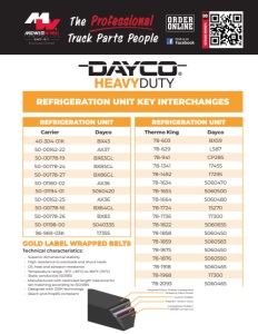 CATALOG NUMBER 00 REFRIGERATION UNIT Thermo King Dayco 78-603 BX59 78-629 L587 78-941 CP285 78-1341 17455 78-1492 17295 78-1634 5060470 78-1655 5060500 78-1664 5060480 78-1724 15270 78-1736 17300 78-1822 5060655 78-1858 5060450 78-1859 5060583 78-1875 5060450 78-1876 5060590 78-1918 5060465 78-1968 17300 78-2093 5060465 REFRIGERATION UNIT Carrier Dayco 40-304-01K BX43 50-00162-22 AX37 50-00178-19 BX63GL 50-00178-24 BX85GL 50-00178-27 BX86GL 50-01180-02 AX36 50-01194-01 5060420 50-00162-25 AX36 50-00178-16 BX64GL 50-00178-26 BX83 50-01198-00 5040335 96-969-03K 17355 GOLD LABEL WRAPPED BELTS Polyester/Cotton: Rubber Impregnated Wrapping Fabric Jacket Cushion Rubber Polyester Tension Cords Compression Rubber: SBR/BR Compound Technical characteristics: • Superior dimensional stability • High resistance to overloads and shock loads • Oil, heat and abrasion resistance • Temperature range: -31°F (-35ºC) to 160ºF (70ºC) • Static conductive ISO1813 • Manufactured with restricted length tolerance for set matching according to ISO4184 • Designed with OEM technology • Reach and Prop65 compliant