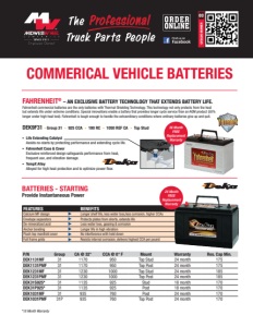 CATALOG NUMBER 03 FAHRENHEIT® – AN EXCLUSIVE BATTERY TECHNOLOGY THAT EXTENDS BATTERY LIFE. Fahrenheit commercial batteries are the only batteries with Thermal Shielding Technology. This technology not only protects from the heat but extends life under extreme conditions. Special innovations enable a battery that provides longer cycle service than an AGM product (50% longer under high heat test). Fahrenheit is tough enough to handle the extraordinary conditions where ordinary batteries give up and quit. ▪ Life Extending Catalyst Avoids no-starts by protecting performance and extending cycle life. ▪ Fahrenheit Case & Cover Exclusive reinforced design safeguards performance from heat, frequent use, and vibration damage. ▪ TempX Alloy Alloyed for high heat protection and to optimize power flow. DEK9F31 ◆ Group 31 ◆ 925 CCA ◆ 190 RC ◆ 1050 REF CA ◆ Top Stud P/N Group CA @ 32° CCA @ 0° F Mount Warranty Res. Cap Min. DEK1131MF 31 1170 950 Top Stud 24 month 175 DEK1131PMF 31 1170 950 Top Post 24 month 175 DEK1231MF 31 1230 1000 Top Stud 24 month 185 DEK1231PMF 31 1230 1000 Top Post 24 month 185 DEK31S925* 31 1135 925 Stud 18 month 170 DEK31P925* 31 1135 925 Post 18 month 170 DEK1031MF 31 935 760 Post 24 month 170 DEK1031PMF 31P 935 760 Top Post 24 month 170 FEATURES BENEFITS Calcium MF design Longer shelf life, less water loss,less corrosion, higher CCAs Envelope separators Protects plates from shorts, extends life De-mineralized acid Less water loss, gassing & corrosion Anchor bonding Longer life in high vibration Flush-top manifold cover No interference with hold down Full frame grids Resists internal corrosion, delivers highest CCA per pound *18 Month Warranty BATTERIES - STARTING Provide Instantaneous Power 24 Month FREE Replacement Warranty COMMERICAL VEHICLE BATTERIES 36 Month FREE Replacement Warranty
