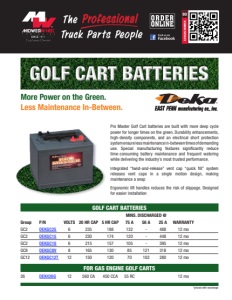 More Power on the Green. Less Maintenance In-Between. Pro Master Golf Cart batteries are built with more deep cycle power for longer times on the green. Durability enhancements, high-density components, and an electrical short protection system ensure less maintenance in-between times of demanding use. Special manufacturing features significantly reduce time-consuming battery maintenance and frequent watering while delivering the industry’s most trusted performance. Integrated “twist-and-release” vent cap “quick fill” system releases vent caps in a single motion design, making maintenance a snap Ergonomic lift handles reduces the risk of slippage. Designed for easier installation CATALOG NUMBER 03 GOLF CART BATTERIES MINS. DISCHARGED @ Group P/N VOLTS 20 HR CAP 5 HR CAP 75 A 56 A 25 A WARRANTY GC2 DEKGC25 6 235 188 132 - 488 12 mo GC2 DEKGC15 6 230 174 120 - 448 12 mo GC2 DEKGC10 6 215 157 105 - 395 12 mo GC8 DEKGC8V 8 165 130 85 121 318 12 mo GC12 DEKGC12T 12 150 120 70 102 280 12 mo FOR GAS ENGINE GOLF CARTS 26 DEK426G 12 560 CA 450 CCA 55 RC 12 mo GOLF CART BATTERIES *priced with exchange
