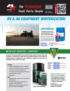 CPICHPA56 55 Gallon Drum CPICH416RV 1 Gallon RV & AG EQUIPMENT WINTERIZATION Guaranteed burst-proof protection down to -50°F, when used full strength. When water freezes it expands 9% which could cause a pipe to burst, this product prevents the expansion and cracking of a pipe. ANTIFREEZE RUST INHIBITOR KL73 RUST INHIBITOR / LUBRICANT Krown KL73 Corrosion Inhibitor is formulated to help control corrosion in the most damaging of environments. Unlike many competitive products, KL73 contains no solvents which are hazardous to the environment, dangerous for the user and damaging to paint, plastic and rubber. FEATURES • Dielectric strength 50kv, safe on all electrical • Remains active despite washing or road wash • Effective in high and low temperatures • Food grade approved throughout North America • Actively displaces moisture • Solvent-free USES • Battery terminals, starter wires, pin connectors, weather packs • Protect the body, chassis, dump beds, salt spreaders, plow attachments • Moving parts, locks, live bottom chains, salt spreader chains, 5th wheel plate With Krown Products you will receive all of these benefits... » Fewer highway breakdowns » Downtime will be reduced » Longer life cycle for vehicles » Increased resale value Resulting in... A better looking, longer lasting, safer vehicle! Spray Tools Available! CATALOG NUMBER 10 Aerosol KRW71400 1 gal. KRW74004 5 gal. KRW74020 55 gal. KRW74205