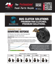 CATALOG NUMBER 18 BUS CLUTCH SOLUTIONS PREMIUM FAN CLUTCHES. PREMIUM SOLUTIONS. DOWNTIME DEFENSE Kit Masters has taken electromagnetic fan clutches to the next level Magnetic Flux Required 100% 50% 0% Kit Masters Competitor MAGNETIC FLUX creates the pull force that engages an electromagnetic fan clutch. The amount of magnetic flux required increases as the friction material wears. Competitor’s designs have enough magnetic flux when the friction is new, but not when the friction is worn, which results in slipping and eventual failure. Kit Masters has engineered a stronger, precisely targeted magnetic flux that remains effective throughout the entire life of the friction material. 2 YEAR 200,000 Mile RESETTING Part # 226611 Blue Bird / Caterpillar C7 Part # 226612 Blue Bird / Caterpillar C7 Part # 226708 Blue Bird / Caterpillar 3126 Part # 226710 Blue Bird / Caterpillar 3126 Part # 226711 Blue Bird / Caterpillar 3126 POPULAR MODELS (VIEW ALL ON BACKSIDE) GUARDIAN Electromagnetic Fan Clutches CONSIDER IT YOUR Learn more at kitmastersuniversity.com 825 1st St. NE, Perham, MN • 800-810-9110