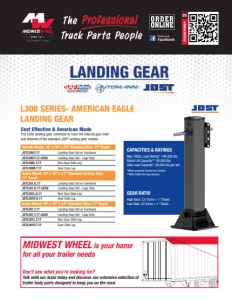 LANDING GEAR CAPACITIES & RATINGS Max. Static Load Rating*: 140,000 lbs Rated Lift Capacity**: 50,000 lbs Side Load Capacity*: 26,000 lbs per set *When properly braced on a trailer. **With 100ft-lbs input torque. GEAR RATIO High Gear: 3.5 Turns = 1” Travel Low Gear: 32 Turns = 1" Travel L300 SERIES- AMERICAN EAGLE LANDING GEAR Cost Effective & American Made The L300 landing gear continues to have the internal gear train and features of the standard JOST landing gear models. Outside Mount, 10" x 10" x 4.5" Standard Shoe, 17" Travel JSTL300.T.17 Landing Gear Set w/ hardware JSTL300.T.17-LEGS Landing Gear Set - Legs Only JSTL300L.T.17 Non-Gear Side Leg JSTL300R.T.17 Gear Side Leg Inside Mount, 10" x 10" x 5.7" Standard Cushion Foot, 17" Travel JSTL301.G.17 Landing Gear Set w/ hardware JSTL301.G.17-LEGS Landing Gear Set - Legs Only JSTL301L.G.17 Non-Gear Side Leg JSTL301R.G.17 Gear Side Leg Inside Mount, 10" x 10" x 4.5" Standard Shoe, 17" Travel JSTL301.T.17 Landing Gear Set w/ hardware JSTL301.T.17-LEGS Landing Gear Set - Legs Only JSTL301L.T.17 Non-Gear Side Leg JSTL301R.T.17 Gear Side Leg CATALOG NUMBER 25 MIDWEST WHEEL is your home for all your trailer needs Don’t see what you’re looking for? Talk with our team today and discover our extensive selection of trailer body parts designed to keep you on the road.