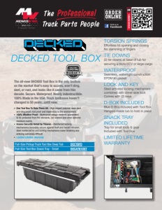 CATALOG NUMBER 28 ▪ One Tool Box To Rule Them All - High impact polymer resin dent and ding proof, rust proof and impervious to the environment ▪ 100% Weather Proof - Waterproof design contents guaranteed to be protected from the elements, car washes and other extreme moisture events ▪ Insane Security Hated by Thieves - Reinforced locking mechanisms incredibly secure against theft and forced intrusion, steel reinforced lid and locking mechanisms make breaking and entering extremely difficult ▪ Limited Lifetime Warrenty The all-new DECKED Tool Box is the only toolbox on the market that's easy to access, won't ding, dent, or rust, and looks like it came from this decade. Secure. Waterproof. Nearly indestructible. 100% Made in the USA. Truck toolboxes haven't changed in 50 years...until now. TORSION SPRINGS Effortless lid opening and closing No slamming of fingers TIE DOWNS (2) tie-downs at base of tub for securing a moto/ATV or large cargo WATERPROOF Seamless, watertight construction EPDM lid gasket LOCK AND KEY Steel armored locking mechanism combined with driver side lock Comes with (2) keys D-BOX INCLUDED Blue D-Box included with Tool Box Hangers inside tub to hold in place SNACK TRAY INCLUDED Tray for small tools & gear Included with Tool Box LIMITED LIFETIME WARRANTY DECKED TOOL BOX Full-Size Pickup Truck Tool Box Deep Tub DECTBFD Full-Size Tool Box Snack Tray - Small DECATB1SST