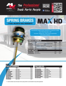SERVICE CHAMBERS P/N Type Stroke PRLSC09HDA Type 9 1.75” K7 KSC12 Type 12 1.75” K7 KSC16 Type 16 2.25” MAXSC20 Type 20 2.25” AK SC20 Type 20 2.25” MAXSC20LS Type 20 XL 3.00” MAXSC24 Type 24 2.25” PRLSC24LSHDA Type 24 XL 3.00” MAXSC30 Type 30 2.50” PRLSC30LSHDA Type 30 XL 3.00” PRLSC36HDA Type 36 3.00” AIR DISC BRAKE CHAMBERS CLEVIS P/N Type PRL30CL1/2HDA Clevis Forged 1/2” Pin 1/2-20 PRL30CLHDA Clevis Forged 1/2” Pin 5/8-18 PRL30CL5/8HDA Clevis Forged 5/8” Pin 5/8-18 PRLPL1/2PIN Clevis Pin 1/2” PRL5/8PINHDA Clevis Pin 5/8” RI R810019 Std Stroke Straight 5/8" RI R810021 Long Stroke Straight 5/8" RI R810025 Std Stroke 5/8" Offset AUT179.YK5012 For Type 9,12,16 Straight RI R810024 For Type 9,12,16 5/8 Offset DIAPHRAGMS P/N Type Stroke AUT179.DT9 Type 9 1.75” AUT179.DT12 Type 12 1.75” AUT179.DT16 Type 16 2.25” AUT179.DT20 Type 20 2.25” AUT179.DT24 Type 24/L 2.25” AUT179.DT20L Type 20L 2.50” AUT179.DT30 Type 30 2.50" AUT179.DT24XL Type 24XL 3.00” AUT179.DT30 Type 30 2.50” PRLD303HDA Type 30L 3.00” AUT179.DT36 Type 36 3.00” AIR DISC BRAKE CHAMBERS SERVICE CHAMBERS BW K028039 Bendix - Type 14 ADB Service Chamber - 2.25" Stroke BW K028226 Bendix - Type 16 ADB Service Chamber - 2.25" Stroke PRLPLSC16.D Aftermarket - Type 16 ADB Service Chamber - 2.5" Stroke BW K028022 Bendix - Type 18 ADB Service Chamber - 2.5" Stroke PRLPLSC18.D Aftermarket - Type 18 ADB Service Chamber - 2.5" Stroke BW K028225 Bendix - Type 20 ADB Service Chamber - 2.5" Stroke PRLPLSC20.D Aftermarket - Type 20 ADB Service Chamber - 2.5" Stroke BW K028252 Bendix - Type 24 ADB Service Chamber - 2.5" Stroke PRLPLSC24.D Aftermarket - Type 24 ADB Service Chamber - 2.5" Stroke SPRING BRAKES - UNHANDED - ROUND PORTS, STANDARD STROKE BW K042457 Bendix 16/24 Chamber - 2.25" Stroke MAX1624D MaxHD 16/24 Chamber - 2.5" Stroke BW K132352 Bendix 18/24 Chamber - 2.25" Stroke MAX1824D MaxHD18/24 Chamber - 2.5" Stroke BW K041960 Bendix 20/24 Chamber - 2.5" Stroke MAX2024D MaxHD 20/24 Chamber - 2.5" Stroke PRLP2424.D Aftermartket 24/24 Chamber - 2.5” Stroke SPRING BRAKES - CLOCKED - SQUARE PORTS, STANDARD STROKE WB 9253800210 Wabco 20/24 Chamber Left Handed - Clocked 45 Degrees - 2.5" Stroke WB 9253800220 Wabco 20/24 Chamber Right Handed - Clocked 45 Degrees - 2.5" Stroke WB 9253840270 Wabco 16/24 Chamber Left Handed - Clocked 45 Degrees - 2.25" Stroke WB 9253840280 Wabco 16/24 Chamber Right Handed - Clocked 45 Degrees - 2.25" Stroke WB 9253470390 Wabco 18/24 Chamber Unhanded - Clocked 45 Degrees - 2.5" Stroke WB 9253470400 Wabco 18/24 Chamber Left Handed - Clocked 45 Degrees - 2.5" Stroke WB 9253470410 Wabco 18/24 Chamber Right Handed - Clocked 45 Degrees - 2.5" Stroke DIAPHRAGM PRLPL-AD-16 Type 16 - Service Chamber Only PRLPL-AD-18 Type 18 - Spring Brake Only PRLPL-AD-20 Type 20 - Spring Brake Only P/N Type PRL006HDA Type 9, 12,16,20,24,24L, 24XL, 30 RETURN SPRINGS PUSH RODS P/N Type PRL034HDA Type 30 HOUSING P/N Type PRL020HDA Type 30