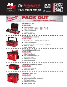 MIDWESTWHEEL.COM MEMBER KANSAS CITY 5801 E. Front St. Main ....(816) 471-1552 Parts....(800) 821-7402 JOPLIN 2424 Stephens Blvd. Main ....(417) 717-6022 Parts....(866) 318-9111 SPRINGFIELD 812 Lillian Dr. ∙ Strafford, MO Main ....(417) 429-2476 Parts....(800) 785-3705 SIOUX CITY 1819 4th St. Main ....(712) 252-7969 Parts....(800) 943-3534 CEDAR RAPIDS 200 50th Ave. S.W. Main ....(319) 365-4453 Parts....(800) 332-5435 DES MOINES 1436 E. Ovid Ave. Main ....(515) 265-1491 Parts....(800) 888-0248 CLEAR LAKE 840 Hwy. 18 W. Main ....(641) 357-7101 Parts....(800) 397-5630 DAVENPORT 8502 Northwest Blvd. Main ....(563) 322-2671 Parts....(800) 553-1886 OMAHA 9770 S 142nd Street, Suite 1 Main ....(531) 239-3050 Parts....(800) 322-8757 NEBRASKA IOWA MISSOURI March 24, 2026 (37Milwaukee Packout Tool Box Flyer) PACKOUT ORGANIZER MLW48-22-8430 • Reinforced Hinge • Includes 8 small and 2 large bins • Exterior Dimensions - 19.7” W x 15.2” D x 4.6” H • Interior Dimensions - 18.0” W x 12.0” D x 3.9” H • Limited Lifetime Warranty PACKOUT LOW-PROFILE ORGANIZER MLW48-22-8431 • Exterior Dimensions - 19.7” W x 16.3” D x 2.5” H • Interior Dimensions - 18.0” W x 12.0” D x 1.8” H • Limited Lifetime Warranty • Heavy Duty Latches • Integrated Center Slot For Long Bits and Blades PACKOUT DEEP ORGANIZER MLW48-22-8432 • 3 Large and 3 Small Dividers • 50lbs Weight Capacity PACKOUT 2-DRAWER TOOL BOX MLW48-22-8442 • Locking Security Bar • 50lbs Weight Capacity • Impact Resistant Body • Internal Organization PACKOUT 3-DRAWER TOOL BOX MLW48-22-8443 • Locking Security Bar • 50lbs Weight Capacity • Impact Resistant Body • Internal Organization • Metal Ball Bearing Drawer Slides • Includes (1) Set of Quick-Adjust Dividers