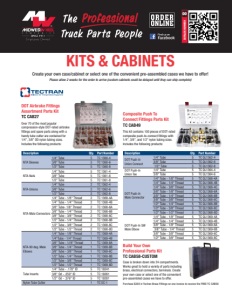 CATALOG NUMBER 00 Composite Push To Connect Fittings Parts Kit TC CAB49 Description Qty. Part Number DOT Push-In Union Connect 1/4" Tube 5 TC QL1362-4 3/8" Tube 5 TC QL1362-6 1/2" Tube 5 TC QL1362-8 DOT Push-In Union Tee 1/4" Tube 5 TC QL1364-4 3/8" Tube 5 TC QL1364-6 DOT Push-In Male Connector 1/4" Tube - 1/8" Thread 5 TC QL1368-4A 1/4" Tube - 1/4" Thread 5 TC QL1368-4B 1/4" Tube - 3/8" Thread 5 TC QL1368-4C 3/8" Tube - 1/8" Thread 5 TC QL1368-6A 3/8" Tube - 1/4" Thread 5 TC QL1368-6B 3/8" Tube - 3/8" Thread 5 TC QL1368-6C 1/2" Tube - 1/4" Thread 5 TC QL1368-8B 1/2" Tube - 3/8" Thread 5 TC QL1368-8C 1/2" Tube - 1/2" Thread 5 TC QL1368-8D DOT Push-In SW Male Elbow 1/4" Tube - 1/8" Thread 5 TC QL1369-4A 1/4" Tube - 1/4" Thread 5 TC QL1369-4B 3/8" Tube - 1/8" Thread 5 TC QL1369-6A 3/8" Tube - 1/4" Thread 5 TC QL1369-6B 3/8" Tube - 3/8" Thread 5 TC QL1369-6C 1/2" Tube - 3/8" Thread 5 TC QL1369-8C DOT Airbrake Fittings Assortment Parts Kit TC CAB27 Description Qty. Part Number NTA Sleeves 1/4" Tube 5 TC 1360-4 3/8" Tube 5 TC 1360-6 1/2" Tube 5 TC 1360-8 NTA-Nuts 1/4" Tube 5 TC 1361-4 3/8" Tube 5 TC 1361-6 1/2" Tube 5 TC 1361-8 NTA-Unions 1/4" Tube 2 TC 1362-4 3/8" Tube 2 TC 1362-6 1/2" Tube 2 TC 1362-8 NTA-Male Connectors 1/4" Tube - 1/8" Thread 2 TC 1368-4A 1/4" Tube - 1/4" Thread 2 TC 1368-4B 3/8" Tube- 1/8" Thread 2 TC 1368-6A 3/8" Tube - 1/4" Thread 2 TC 1368-6B 3/8" Tube - 3/8" Thread 2 TC 1368-6C 1/2" Tube - 1/4" Thread 2 TC 1368-8B 1/2" Tube - 3/8" Thread 2 TC 1368-8C 1/2" Tube - 1/2" Thread 2 TC 1368-8D NTA-90 deg. Male Elbows 1/4" Tube - 1/8" Thread 1 TC 1369-4A 1/4"Tube - 1/4" Thread 1 TC 1369-4B 3/8" Tube - 1//8" Thread 1 TC 1369-6A 3/8" Tube - 1/4" Thread 1 TC 1369-6B 3/8" Tube - 3/8" Thread 1 TC 1369-6C 1/2" Tube - 1/4" Thread 1 TC 1369-8B 1/2" Tube - 3/8" Thread 1 TC 1369-8C 1/2" Tube - 1/2" Thread 1 TC 1369-8D Tube Inserts 1/4" Tube - .170" ID 5 TC 19241 3/8" Od - .250" ID 5 TC 19261 1/2" Od - .376" ID 5 TC 19281 Nylon Tube Cutter 1 TC SC-1 Build Your Own Professional Parts Kit TC CAB58-CUSTOM Case is broken down into 24 compartments. Works great to hold a variety of parts including brass, electrical connectors, terminals. Create your own case or select one of the convenient pre-assembled cases we have to offer. Purchase $300 in Tectran Brass Fittings on one invoice to receive the FREE TC CAB58 Over 70 of the most popular compression-style DOT-rated airbrake fittings and spare parts along with a handy tube cutter are contained for 1/4”, 3/8” OD nylon tubing sizes. Includes the following products: This kit contains 100 pieces of DOT-rated composite push-to-connect fittings with 1/4”, 3/8”, and 1/2” nylon tubing sizes. Includes the following products: KITS & CABINETS Create your own case/cabinet or select one of the convenient pre-assembled cases we have to offer! Please allow 2 weeks for the order to arrive (custom cabinets could be delayed until they can ship complete)